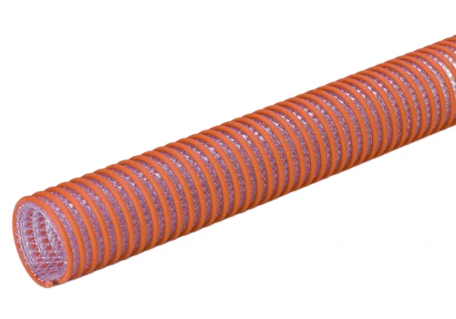 Manguera de PVC flexible con espiral de PVC rígido indeformable. Pared interior lisa. Trasvase de pescado por bombeo de agua marina. Atóxica y de uso alimentario, SIN O-FHTALATOS
